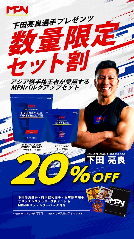 !数量限定!20%オフ!【下田亮良選手プレゼンツ バルクアップセット】ハイドロライズド・ホエイアイソレート (ブラッドオレンジ風味)& BCAA NEO 期間限定!